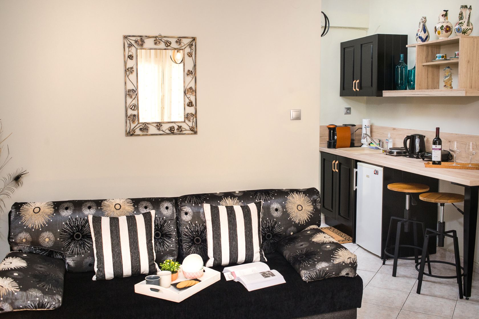 Το γούστο στη διακόσμηση και η εργονομία στο χώρο είναι αυτά που θα σε εντυπωσιάσουν με το που θα ανοίξεις την πόρτα , δίπλα στο Περιφερειακό δρόμο της Θεσσαλονίκης στο δεύτερο όροφο ενός συγκροτήματος κατοικιών σε πολυσύχναστο δρόμο στα Κωνσταντινοπολίτικα.